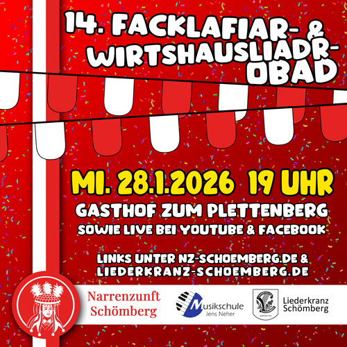 Am Mittwoch, 28. Januar 2026 findet um 19:00 Uhr im Gasthof zum Plettenberg in Schömberg bereits zum 14. Mal das Facklafiar- und Wirtshausliedersingen statt. Wie schon die letzte Jahre werden Jürgen Riedlinger und Jens Neher einen geselligen Abend mit zahlreichen Fasnets-, Wirtshaus- und Facklasonndigsliedern sowie der ein oder anderen Geschichte präsentieren.
